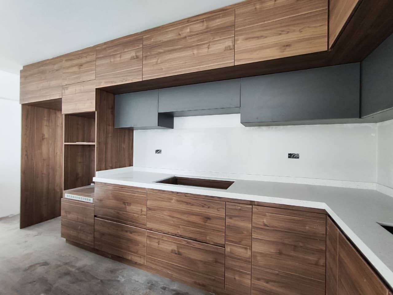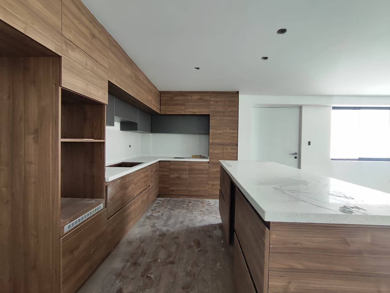 Cocina Moderna: Diseño de concepto abierto con isla central, desayunador y mesones de alta calidad.