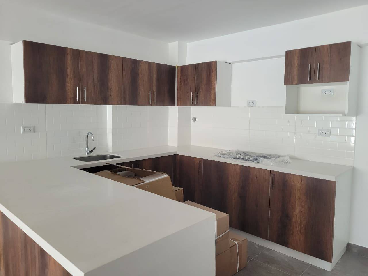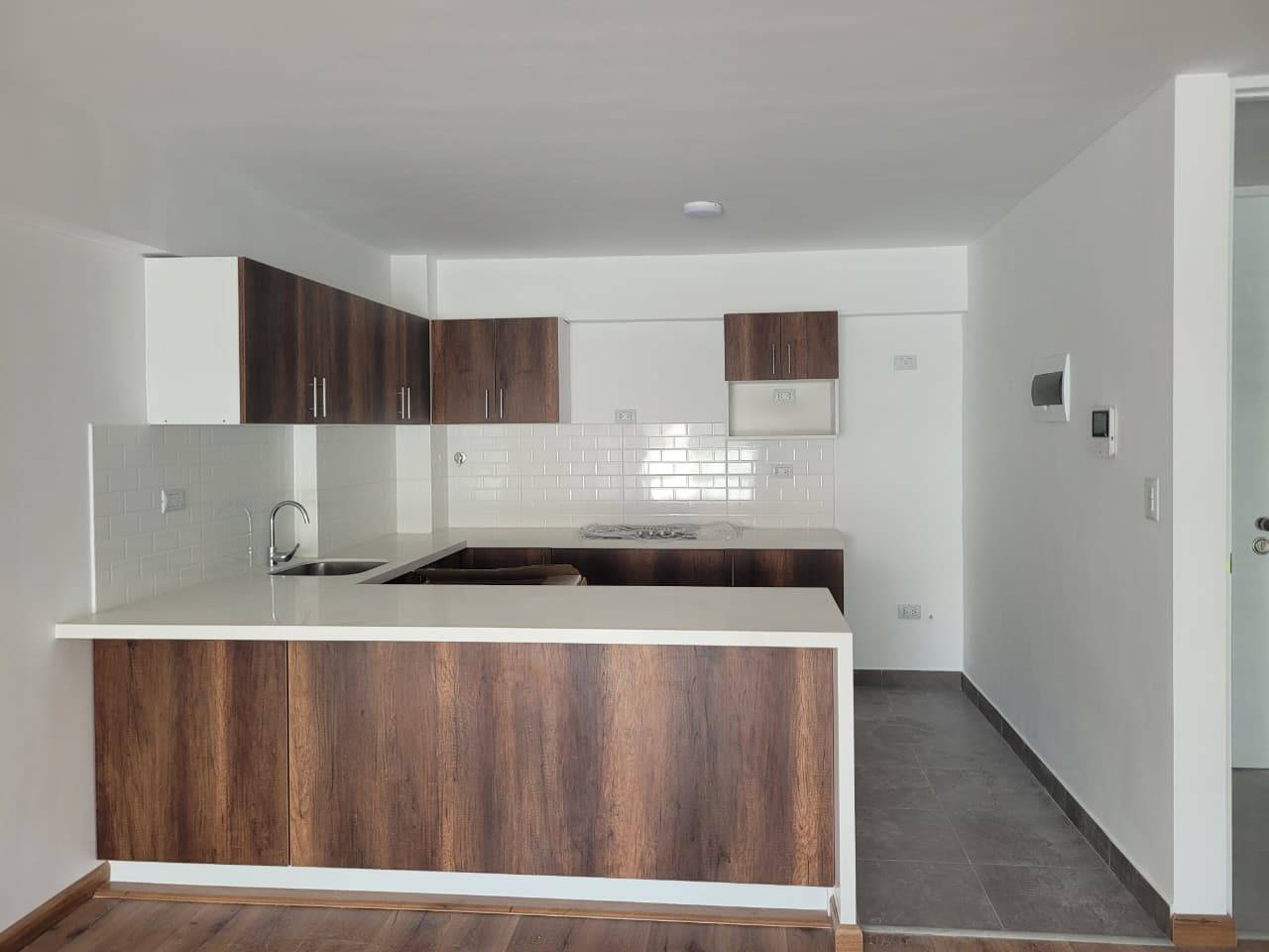 Cocina Moderna: Estilo americano, full equipada con encimera, horno empotrado, campana extractora, refrigeradora y microondas.